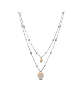 Collana donna con doppia catena in acciaio con 38 sfere e pendente a cuore in acciaio impreziosito da microcristalli argentei.