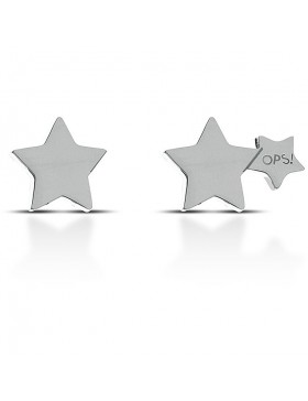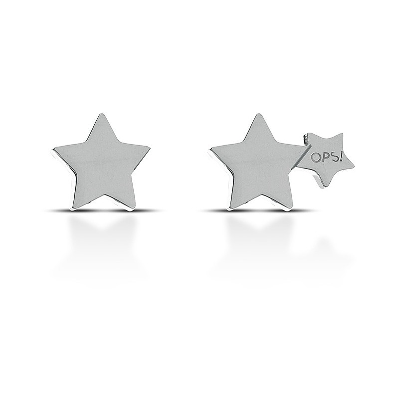 Orecchini donna a lobo a forma di stella in acciaio color argento, di cui uno con doppia stella con logo OPS!