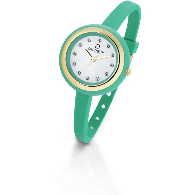 Orologio solo tempo di ops della collezione OPS BON BON con cassa in policarbonato rotonda di colore verde, diametro cassa 34 mm, spessore cassa 1 cm. questo orologio ha indici con pietre, quadrante bianco e cinturino in silicone spessore 8 mm. modello resistente all'acqua 3atm e movimento al quarzo. datario: no.