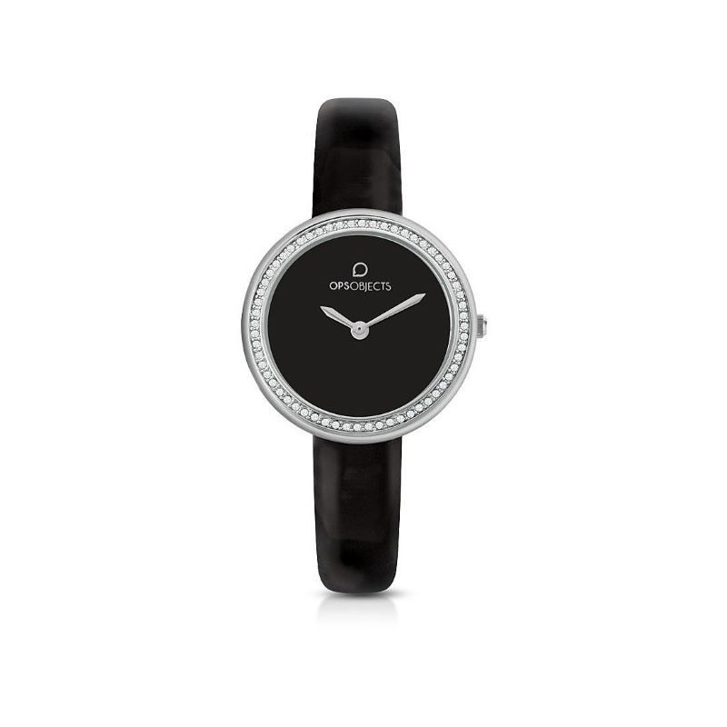 Orologio solo tempo da donna di Ops Objects della collezione ops!cute. Orologio con cassa rotonda in metallo di colore argento del diametro di 28mm. Il quadrante è di colore nero con lunetta con cristalli. Il cinturino è in similpelle di colore nero. Il movimento è vx00. La resistenza all'acqua è di 3 atm. La referenza è opspw-671