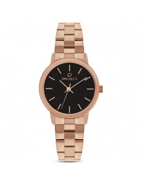Orologio da donna di Ops Objects della collezione hera. Orologio di colore nero. Orologio con cassa in acciaio di colore rosa oro di 32 mm con indici, fondello in acciaio e quadrante nero. Orologio con cinturino bracciale in acciaio lucido e satinato, con chiusura diver in acciaio. Orologio con resistenza all'acqua di 3 atm e movimento y121. La referenza è opspw-723