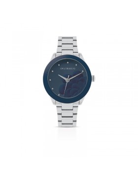 Orologio solo tempo da donna di Ops Objects della collezione blooming love. Orologio con cassa in metallo, lunetta smaltata blu, quadrante blu con fiore a rilievo e bracciale in acciaio. La referenza è opspw-827