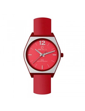 Orologio solo tempo da donna di OPS!OBJECTS della collezione Shake con cassa in policarbonato diametro di 36 mm, movimento al quarzo, quadrante rosso e alluminio con indici e sfere in lumibrite, Bracciale in silicone anallergico rosso, corona in acciaio a pressione, fondello a pressione.