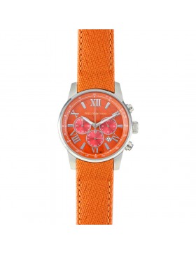 Orologio RoccoBarocco, Collezione SAINT TROPEZ, Cassa (40mm) acciaio, quadrante arancio con effetto marmorizzato, cronografo con datario, movimento Jpn, cinturino in pelle saffiano arancio, Referenza: RB0172