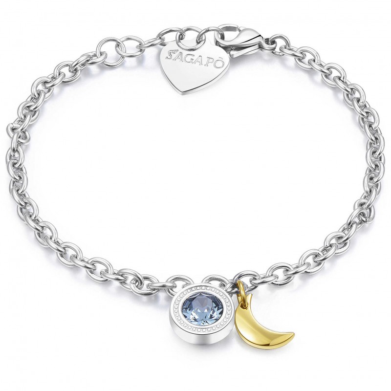 Bracciale in acciaio 316L con cristallo Swarovski Indian Sapphire e pendente a forma di luna in pvd oro