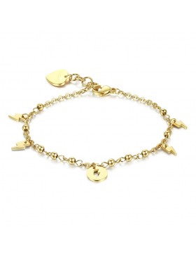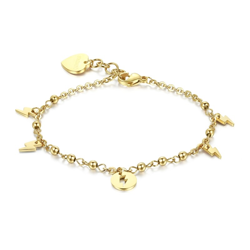 Bracciale in acciaio 316L e pvd oro con pendenti a forma di saetta e sfere in pvd oro. Questo bracciale verrà spedito con scatola originale.