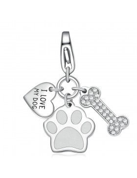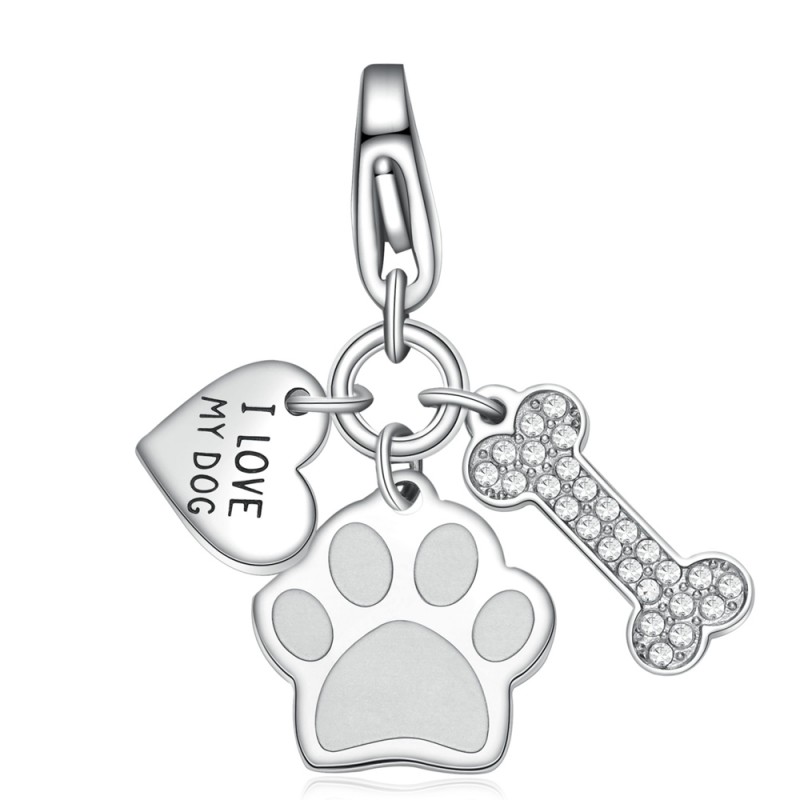 Charm in acciaio 316L con tre pendenti a forma di impronta, osso e cristalli bianchi e piastrina incisa "I love my dog".