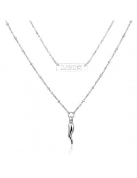 Collana a due fili in acciaio 316L con targhetta con scritta luck e cornetto della portafortuna.