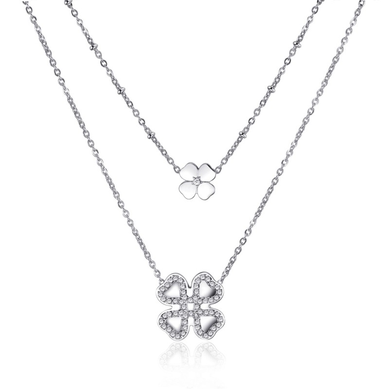 Collana a due fili in acciaio 316L con pendente a forma di quadrifoglio e cristalli bianchi