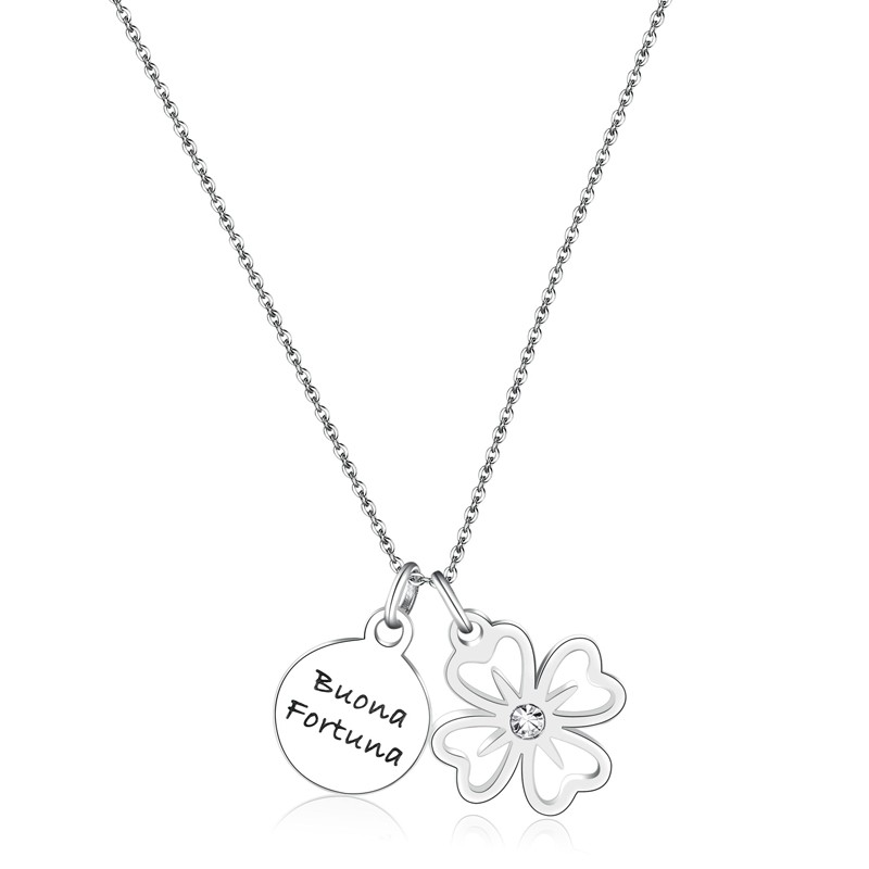 Collana in acciaio 316L con pendente a forma di quadrifoglio con cristallo e medaglietta incisa "Buona fortuna".