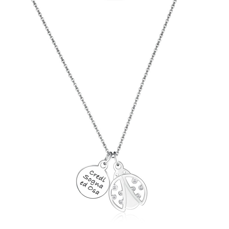 Collana in acciaio 316L con pendente a forma di coccinella con cristalli bianchi e medaglietta incisa "Credi sogna ed osa".