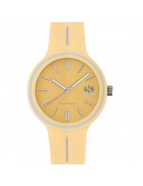 Orologio solo tempo da donna SUPERGA. Cassa in silicone del diametro di 35mm, indici applicati e cinturino in silicone di colore giallo ocra. Orologio con movimento miyota 2035 e resistenza all'acqua di 5 ATM.