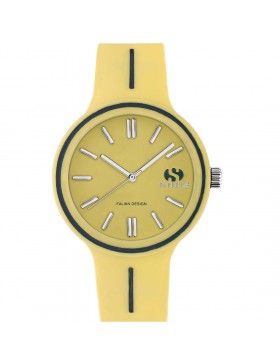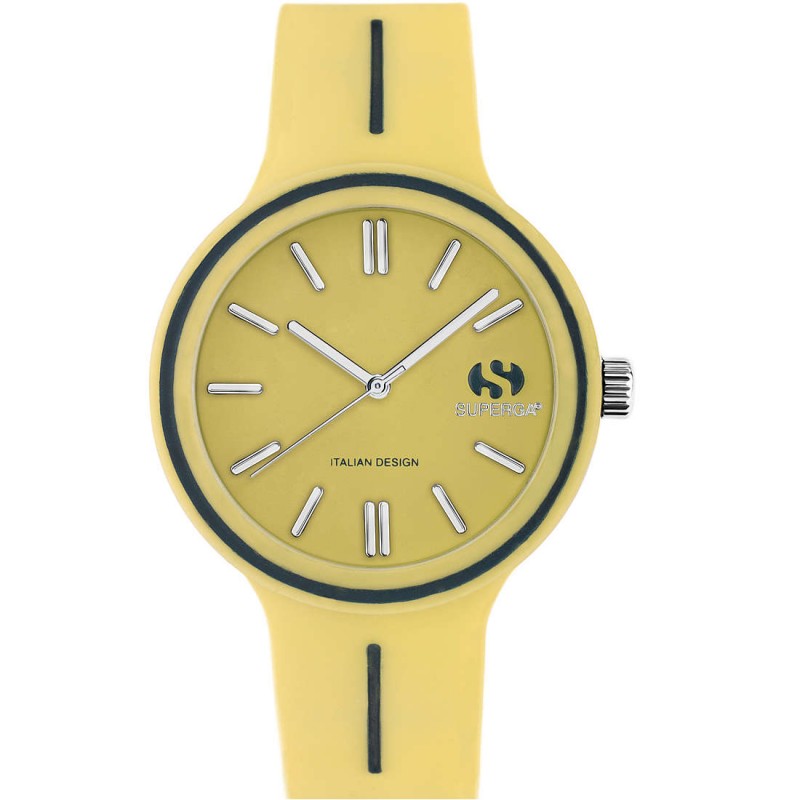 Orologio solo tempo da donna SUPERGA. Cassa in silicone del diametro di 35mm, indici applicati e cinturino in silicone di colore giallo. Orologio con movimento miyota 2035 e resistenza all'acqua di 5 ATM.