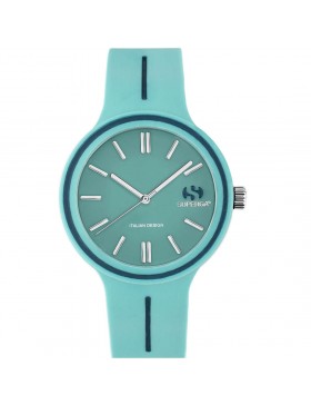 Orologio solo tempo da donna SUPERGA. Cassa in silicone del diametro di 35mm, indici applicati e cinturino in silicone di colore verde acqua. Orologio con movimento miyota 2035 e resistenza all'acqua di 5 ATM.